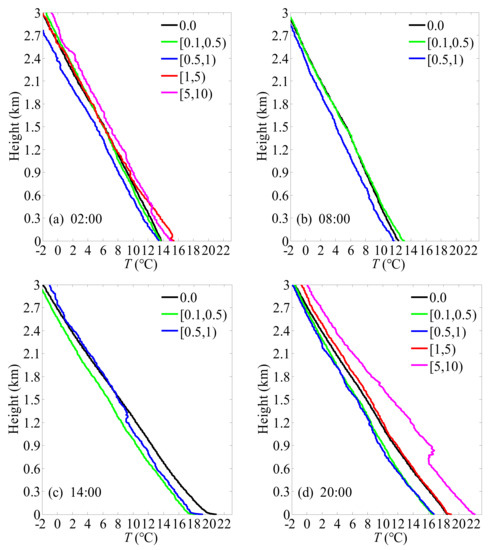 Figure 4 shows the atmospheric temperature profiles in different precipitation grades at launch times in Jiulong from 2013–2020. The background (i.e., no precipitation) atmospheric temperature profile (black line) presents a diurnal variation, in which the temperature is lower at 02 and 08 LST and higher at 14 and 20 LST, showing a response to solar radiation which is more obvious near the surface layer. Under precipitation conditions, the temperature profiles for hourly precipitation within 1 mm generally present a cold bias to the background atmospheric temperature profile, but hourly precipitation above 1 mm generally present a warm bias. This may indicate that precipitation with intensity less than 1 mm/h is mainly caused by cold air advection, while precipitation with intensity greater than 1 mm/h is mainly caused by warm air convection in the lower layer. Considering air convection is caused by atmospheric instability the greater the vertical gradient of atmospheric temperature the more unstable the atmosphere is. Therefore, the temperature gradient for precipitation intensity greater than 1 mm/h at 20 and 02 LST is greater than that of the background atmosphere. Note that although the warm air convection mainly caused by solar radiation exists during the day, it hardly results in precipitation due to the dry air in low level during the day over the TP. However, at nighttime the low level air is wet, and the air convection caused by dynamic uplift of terrain can result in precipitation [25]. Moreover, the deviation between precipitation and background atmospheric temperature profiles partly depends on precipitation intensity. This is especially true at 20 LST, where the deviation for precipitation intensity above 5 mm/h is greater than that for precipitation intensity within 5 mm/h. This presents a complex variability of atmospheric thermal stratification over the TP, indicating that condensation latent heat is released in addition to solar radiation and the underlying surface [7]. The influence of these factors on atmospheric thermal stratification over the TP needs to be further studied. Additionally, the deviation between precipitation and background atmospheric temperature profiles is larger in low level than in high level, but the maximum deviation does not appear near the surface layer because of the inversion layer, which is consistent with the results of Lu and Li [18].