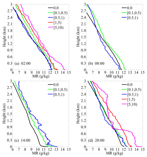 The background atmospheric humidity profile at launch times in Jiulong from 2013–2020 also presents a pattern of diurnal variation. As shown in Figure 5, background atmospheric specific humidity is lower in the daytime and higher at nighttime.This is consistent with the observation obtained by ground-based microwave radiometer in Ganzi (approximately 330 km northwest of Jiulong), which shows the air is warm and dry during the daytime while cool and wet at nighttime [25]. In general, the specific humidity profile under precipitation presents a wet bias to that of background atmosphere and the bias generally increases with precipitation intensity, indicating that water vapor supply is an important factor affecting precipitation intensity. Moreover, the higher the precipitation grade, the stronger the vertical fluctuation of the corresponding specific humidity profile, especially for hourly precipitation greater than 1 mm at nighttime. This may imply that the dynamic uplift of terrain plays an important role in nighttime precipitation. All the specific humidity profiles show that specific humidity is generally higher near the ground and decreases gradually with height. However, below the inversion layer there is an inverse humidity layer which is consistent with [18]. This phenomenon occurs because when there is an inversion layer in the atmosphere, the atmospheric stratification state is generally very stable, and this stable structure can make a large amount of water vapor stay in the inversion layer and accumulate to form an inverse humidity layer [26]. Similar to temperature profiles, the deviation of a specific humidity profile between precipitation and background atmosphere is larger in low level than in high level, but the maximum deviation does not appear near the surface layer because of the existence of the inversion humidity layer.