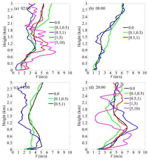 Atmospheric horizontal wind speed profiles in different precipitation grades at launch times in Jiulong from 2013–2020. (a) 02 LST, (b) 08 LST, (c) 14 LST and (d) 20 LST.