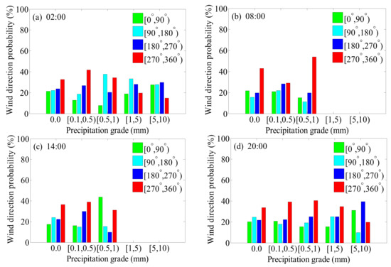 Atmospheric horizontal wind direction probability below 3 km in different precipitation grades at launch times in Jiulong from 2013–2020. (a) 02 LST, (b) 08 LST, (c) 14 LST and (d) 20 LST.