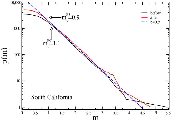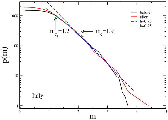 Notice that for the Italian catalogue there exists a breaking point, at for both the curves, in the exponential trend of the distribution, marking two different scaling intervals. Indeed, it is possible to model the GR distribution using two different b values: 0.75 in the range , and 0.95 for . In the following, we assume for the value 1.9 and for b the value 0.95. This should guarantee the best selection of the complete portion of the catalogue.