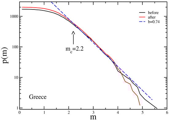 The Gutenberg–Richter distribution for the Greece catalogue. The dashed line represents the fit for .