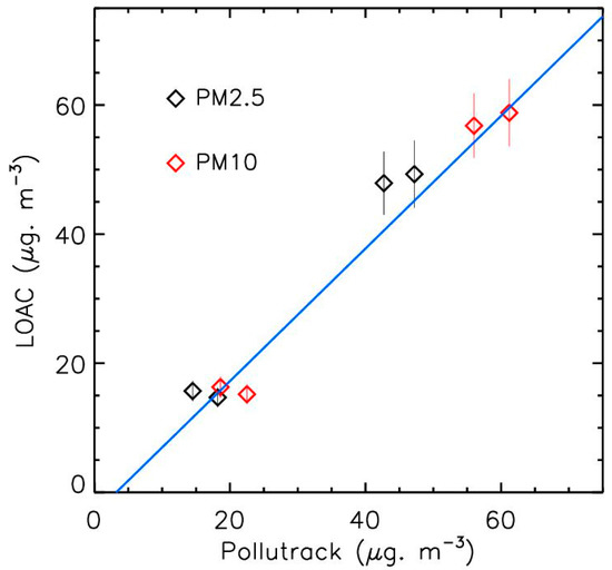 Four sessions of 40 min of measurement were conducted in 4 different locations on 23 October 2019 and 6 November 2019. Figure 2 presents the inter-comparison of the measurements from the two instruments for PM2.5 and PM10 mass-concentrations integrated each day. When combining the PM2.5 and PM10 measurements, the correlation is of 0.98, the slope of the fit is of 1.0 and the value at origin is −3.3 µg. m−3. The standard deviation between Pollutrack and LOAC measurements is about 4 µg. m−3, which potentially demonstrates a first indicator of the Pollutrack Sensor’s accuracy in static conditions.