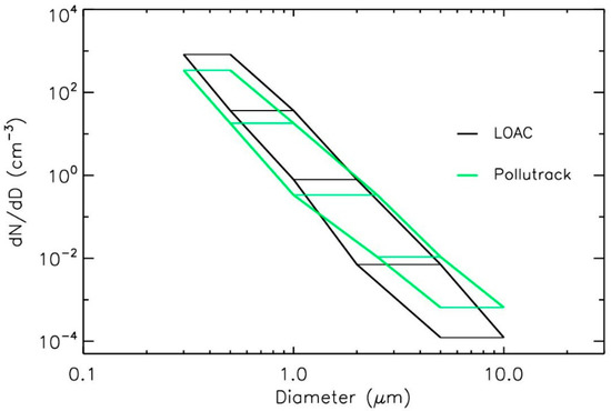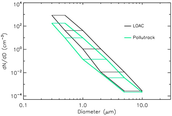 Mean size distribution for the Pollutrack and LOAC sensors at the “Ballon de Paris Generali” for the 20 May 2020 to 31 December 2020 period.