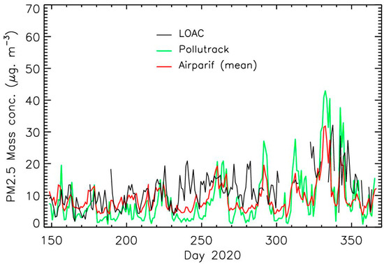 As stated previously, the main goal of Pollutrack is to provide the PM2.5 mass-concentrations. Accordingly, Pollutrack’s daily averaged measurements are compared to the daily averaged PM2.5 LOAC mass-concentrations and to the low-oriented PM2.5 measurements of the Airparif air quality network (Figure 4). From the 13 Airparif PM2.5 measuring stations operated in the Paris Region [19], we have chosen 4 of them that are in the south of Paris and its surrounding region, which are representative of the pollution conditions that can be encountered at the “Ballon de Paris Generali”.