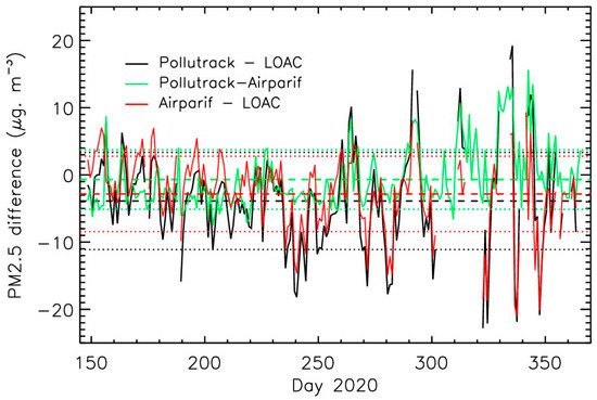 Figure 4 and Table 1 present the difference between the 3 different sets of values (the amplitude of the values is not large enough to plot a correlation that can provide significant results). The standard deviation of the difference of Pollutrack sensors with the two other sensors remains in the 4–6 µg. m−3 range (Figure 5), with no significant permanent bias (mean of the differences below 2 µg. m−3). Considering the LOAC uncertainties that are of ±20% and the TEOM microbalances like those used by the Airparif network that can suffer of uncertainties of several µg. m−3 [24], we can consider that the agreement between all these instruments is satisfactory.