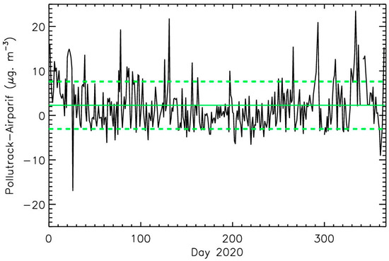 Black line: difference between Pollutrack and Airparif daily averaged PM2.5 measurements Full green line: mean; green dashed line: standard deviation.