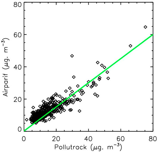 This time, we have considered all of the Pollutrack measurements performed at less than 100 m distance from the Airparif station over the entire year of 2020. More than five sessions of measurements per day are available for 343 days (over the 366 days of 2020, or 94%) with an average of 20 sessions per day. The daily averaged Pollutrack and Airparif data demonstrate very good agreement (Figure 6); the Pollutrack sensors have detected all the main pollution events. The mean difference between the two set of data is of 2.3 µg. m−3 with a standard deviation of 5.3 µg. m−3 (Figure 7). The Pollutrack measurements are on average a little higher than the Airparif ones. In the correlation plot (Figure 8) the slope of the fit is of 0.75, and the value at origin is of 0.2 µg. m−3, with a correlation of 0.88. Reducing the Pollutrack value by 25% will reduce the mean difference to 1.7 µg. m−3 with a standard deviation of 3.7 µg. m−3, and the slope in the correlation plot will be of 1.0. This 25% difference could be partly due to the difference in the collecting conditions since the Pollutrack inlets are at a lower height (about 2 m) than for the Airparif sensors and are well inside the traffic area and thus much closer to the pollution sources.