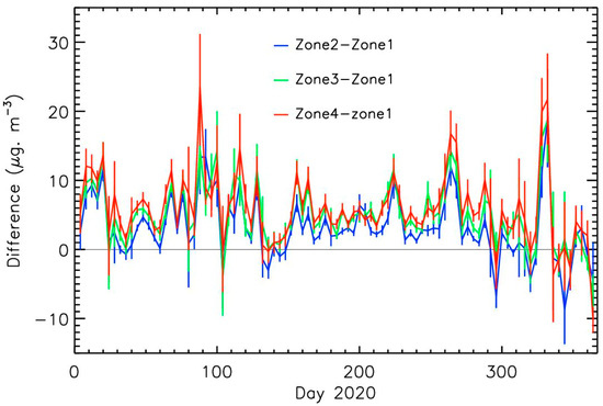 Four locations were chosen to illustrate this spatial variability (Figure 11). Zone 1 corresponds to the lower PM2.5 levels, zone 4 corresponds to the higher PM2.5 levels, and zones 2 and 3 are representative of medium levels. The data are averaged every 4 days to point out the main trends. (Figure 12). During background conditions and during some moderate pollution events <20 µg. m−3 at around days 115 and days 260–270, the zone 1 measurements are always below the other zone measurements with a difference of up to 15 µg. m−3 (thus well above the sensor uncertainty), as shown in Figure 13. This could be explained by a lower level of primary PM sources in this zone compared to the other zones. On the other hand, during some pollution events, around days 25, 80, 105, 290, 315 and 335–345, the four zones exhibit similar values. This could indicate the presence of imported pollution and the production of secondary aerosols at a regional scale. Additionally, the local sources that occupy the boundary area during anticyclonic conditions, as for the days 330–345, can slowly extend to cover all the city. This last case can explain why the PM2.5 content is lower for zone 1 than for the other zones at the beginning of the pollution event in day 330, and then progressively increases to reach the same level as for the other zones few days later.