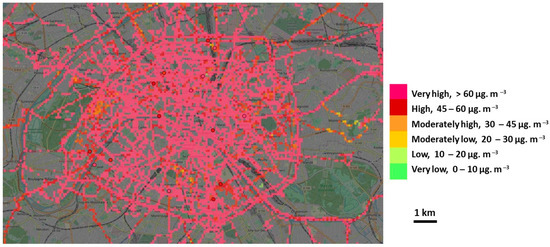 The situation was different for the two moderate pollution peaks in the 20–30th March 2020 periods (days 80–90). These events occurred during the French COVID-19 lockdown (17 March–11 May 2020), where almost all activities were stopped apart from the heating which continued. Obviously, the traffic strongly decreased and thus the number of Pollutrack measurements. The data were averaged over 3 days (26–28 March) to reach a sufficient spatial coverage. This time, the pollution content was not homogeneous, from 20 to 60 µg. m−3 depending on the location inside Paris (Figure 15), with some “hot spots” mostly in the North and East of Paris and lowest values in the West.