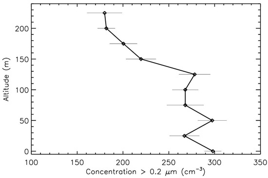 Finally, the highest pollution levels were detected between 21 and 26 January 2020, during strong winter anticyclonic conditions. This time, the pollution seemed relatively spatially homogenous, with values often above 60 µg. m−3 (Figure 17). Vertical profile of the particle number concentrations performed by the LOAC instrument on the 22 January 2020 at the “Ballon de Paris Generali” during the beginning of the pollution episode indicates that the concentrations of particles greater than 0.2 µm remained stable for altitude below 150 m and then decrease above this height. (Figure 18). This situation is similar to the mid-December 2013 pollution event in Paris [22] where the pollution, coming from traffic, heating and industrial activities, was confined close to the ground due to the presence of a temperature inversion layer.