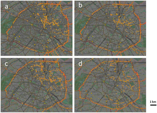 Daily maps where the measurements are averaged in squares of 100 m side length are used to analyze the different PM2.5 pollution conditions encountered in 2020. As shown in Figure 12, the pollution levels were low from June to September 2020, well below 10 µg. m−3, mainly because of the reduction of industrial and tourist activities during the COVID-19 crisis and the summer holidays. Figure 14 presents the pollution map for the 1 of July 2020 (the grey zones correspond to the absence of measurements). The higher values were obtained for some parts the Paris beltway, some main highways leaving Paris, and locally in some streets and crossroads. Nevertheless, inside Paris, the values remain low and relatively homogenous.
