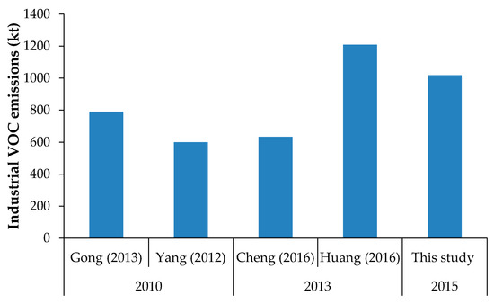 The industrial VOC emissions of Hebei Province calculated in prior studies from the past few years are summarized and compared in Figure 2. The estimated total industrial VOC emissions in this study were about 22.4–52.1% higher than those of Gong (2013) [4], Yang (2012) [26], and Cheng (2013) [45], and 18.8% lower than the results of Huang (2016) [5]. These differences may have been caused by the following: (1) The selection of activity data: activity data for 81 types of industrial sources were collected by Huang (2016) [5], and this study selected only 74 types, which caused Huang (2016) [5] to show higher emissions. For example, the crude oil processing volume in this study was considered to be activity data of petroleum refining based on technical guidelines, while the tank loss, transport loss, leakage loss, and volatile refining wastewater of Huang (2016) [5] were chosen according to references. (2) The interannual variation in activity levels: The VOC emission inventories of other studies were for periods 3–5 years earlier than that of this study. In fact, VOC emissions have been increasing yearly, owing to the increase in the scale and number of industrial enterprises in Hebei Province. (3) The selection of EFs: For crude oil exploration sources, 1.5275 g/kg crude oil in this study represented the VOC emission factor from crude oil exploration, rather than the 0.6 kg/t found by Yang (2012) [26] and Huang (2016) [5], due to the EF being derived from the latest officially published data, which was highly representative. (4) The determination of key industrial sources: Cheng (2013) [45] estimated the VOC emissions of eight key industries in Hebei Province in 2013, including the chemical medicine, coke production, organic chemical, packaging and printing, wood adhesives, industrial and construction dyes, furniture manufacturing, and crude oil processing industries. The total emissions found by Cheng (2013) [45] were 633.2 kt, while the corresponding emissions of the eight key industries in this study were found to be 677.8 kt. Therefore, the results of this study are reasonable and acceptable.