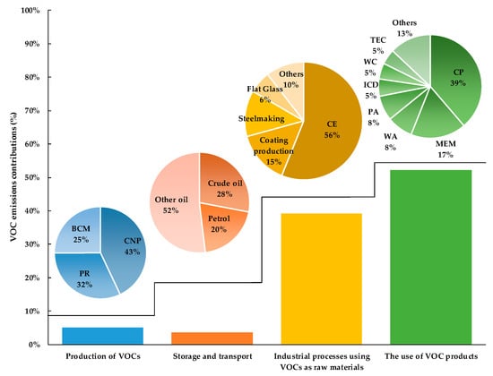 The classification of emission source is an important basis for the development of emission inventories. In this study, the sources of industrial VOCs emissions were grouped into four types—including the production of VOCs, storage and transport, the industrial processes using VOCs as raw materials, and the use of VOC products—based on the source tracing method employed in most studies [3,19,34,35,36,37,38].