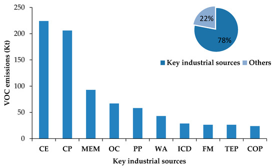 VOC emissions of key industrial sources (CE: chemical medicine; CP: coke production; MEM: mechanical equipment manufacturing; OC: organic chemical; PP: packaging and printing; WA: wood adhesives; ICD: industrial and construction dyes; FM: furniture manufacturing; TEP: transportation equipment manufacturing; COP: crude oil processing).