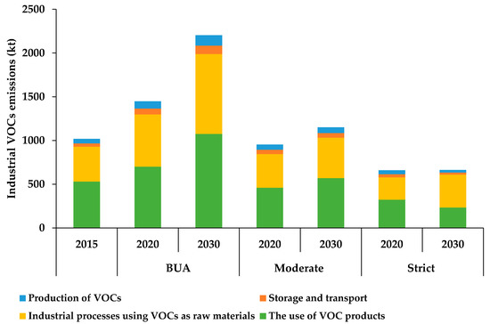 Figure 6 also shows the reduction in VOC emissions from different industrial sectors under the different scenarios. A significant emission abatement would be achieved with the use of VOC products for all scenarios, with the exception of the strict scenario in 2030, where the emissions from industrial processes using VOCs as raw materials were greater. These two large sources collectively accounted for 87.63–89.63% and 89.73–91.97% of the total under the moderate and strict scenarios in 2020 and 2030, respectively.