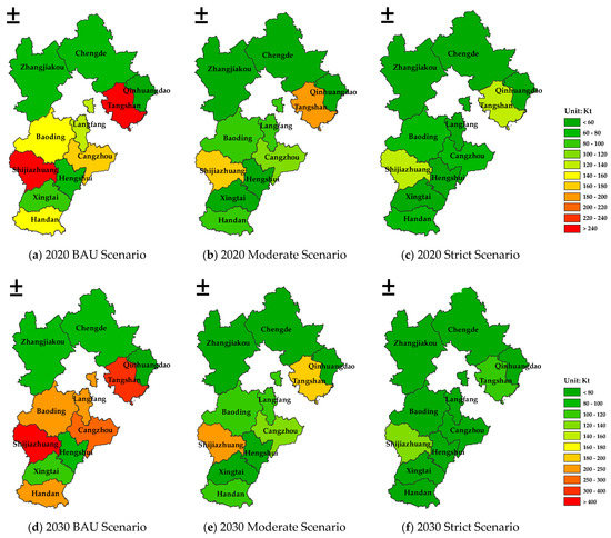 Figure 7 shows the emission reductions in different cities in Hebei Province under different scenarios. Due to the unbalanced regional economic developments existing in Hebei Province, the VOC emissions projected among the 11 cities showed large differences during the period 2015–2030. These projections revealed that Shijiazhuang and Tangshan were and will continue to be the largest contributors under the BAU scenario. These two cities located in the central and southern areas are developed regions with high population densities and high GDPs. On the contrary, Zhangjiakou, Chengde, and Qinhuangdao, located in the northern area with sparse populations and slow economic growth, have relatively low emissions and growth trends. These results prove that VOC emissions will be out of control if VOC emissions are not governed immediately. A significant decrease occurred in the moderate and strict scenarios. Moreover, relatively high values of reduction were projected in cities that are major contributors to total emissions, and relatively low values were projected in cities with the more minor contributions. Therefore, it can be concluded that the measures defined in both scenarios appear to be effective in reducing industrial VOC emissions.