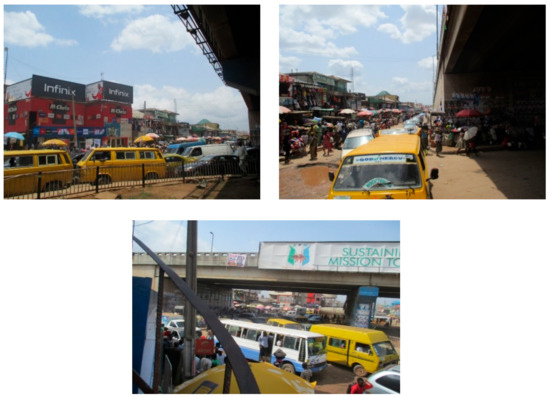 This study was conducted at the Sango-Ota roundabout interchange. The junction is located in the heart of the Ado-Odo/Ota local government area of Ogun State, Nigeria, around Longitude 6°42′27″ N and Latitude 3°14′33″ E, as shown in Figure 2. It serves as the conflict resolution point for traffic on the Lagos–Abeokuta (grade-separated) expressway and the Idiroko–Ijoko (at-grade) road. Traffic studies conducted by Abdul-rahman [26] showed that the Sango section of Idiroko road over-capacitated by about 93% of its design capacity [26]. With such high traffic density, congestions on the road segments and at the intersection are virtually constant throughout the day, with peaks at certain periods, consequently resulting in high concentrations of air pollutants. Figure 3 shows the poor road condition and traffic condition commonly experienced at the Sango-Ota intersection.