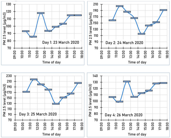 - The highest level of PM2.5 obtained on Day 1 (Monday) and Day 4 (Thursday) were about 45.1% and 38.6%, respectively, lower than that of Day 3 (Wednesday).