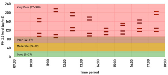The PM2.5 level results were further compared to the permissible thresholds set by the WHO [17] and the EPA Victoria [28]. The WHO’s 24 h threshold for PM2.5 is ≤25 µg/m3, while the EPA Victoria threshold for moderate PM2.5 concentration in air is set at 27–62 µg/m3 maximum averaged over 1 h or 25 µg/m3 maximum averaged over 24 h. PM2.5 in this study was assessed over an 8 h period, as such, based on the EPA Victoria criteria, the concentration of PM2.5 at the Sango-Ota intersection is “very poor” since the recorded hourly averaged concentrations fall between 97 and 370 µg/m3, as shown in Figure 6.