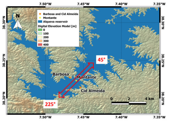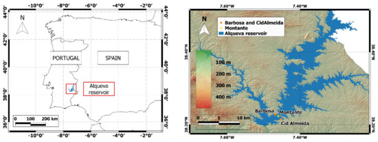 The Alqueva reservoir is located along 83 km of the main course of Guadiana River, in the interior of Alentejo, as shown in Figure 1. Considered one of the largest artificial lakes in Europe, it represents a strategic water reserve for the south of Portugal covering the municipalities of Moura, Portel, Mourão, Reguengos de Monsaraz and Alandroal and occupying an area of 250 km2 with a flood flow of 12,000 m3/s [28,29,30] and maximum depth of 65 m. The reservoir is a large natural laboratory for the study of the interaction between inland water bodies and the atmosphere. This artificial lake, belonging to the Guadiana basin, has significantly modified the landscape of the region and has impacts on the local climate that are still poorly documented [31].