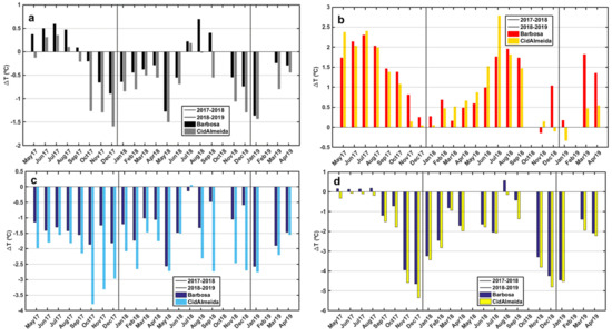 Monthly temperature differences between onshore stations (Barbosa and Cid Almeida) and platform station (Montante) for: (a) mean air temperature; (b) maximum air temperature; (c) minimum air temperature. (d) Monthly difference between air temperature in onshore stations and water temperature at 0.5 m depth (in Montante station). Grey vertical lines separate the years 2017, 2018 and 2019.