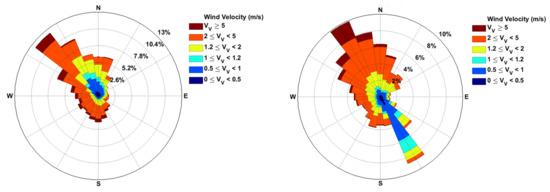 Wind roses for the full period in Barbosa station (left panel) and for CidAlmeida station (right panel).