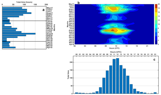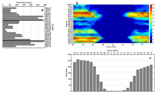 Land breeze occurrences in hours representing monthly (a), daily cycle per month (b) and daily cycle for all period (c). Grey horizontal lines in panel (a) separate the years 2017, 2018 and 2019.