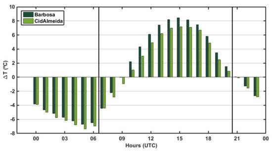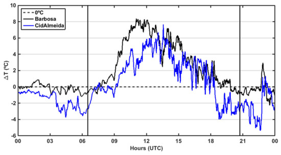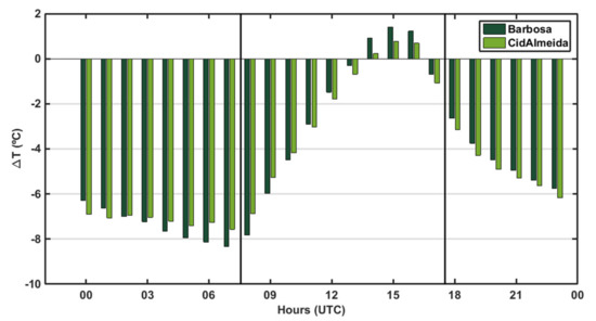 August 2018 was the month with highest thermal gradient between Barbosa and the middle of the reservoir, as well as highest thermal gradient between air in the Barbosa and the lake water. While in Cid Almeida the highest thermal gradient occurred in July 2017, the second higher for Barbosa was in this month. The highest gradient in August 2018 led to the highest lake breeze occurrences of the whole period, as mentioned before. The daily cycle of the temperature difference between air at the shores and water in Montante for August 2018 is shown in Figure 6. The air temperature in the onshore stations is higher than the water temperature during daytime, coinciding with the period with the highest lake breezes occurrence. During night-time and early morning, the land surface cools and the difference becomes negative, inhibiting the formation of the lake breeze, but allowing the formation of land breezes (discussion in the next section).