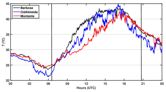During the night and early morning, air temperature in Montante (red line) is higher than the temperature in the onshore stations, with anomalies down to −5 °C, as can be seen in the lower panel, thus leading to the development of land breezes. During the morning and afternoon, the temperature was very close between the three stations, inhibiting the formation of breezes. From 16:00 onwards the difference became negative again in Cid Almeida while in Barbosa only at 19:00.