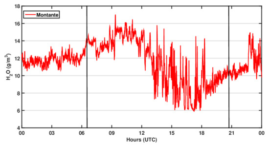 During 3 August 2018 there was a gradual increase in water vapor concentration in Montante station, reaching 15 g/m3, as can be seen in Figure 8. This situation lasted until around 11:00, followed by a decrease in water vapor concentration until 18:00 when it starts again to increase. The drop of water vapor in the early afternoon is a signature of the descending branch of the breeze circulation, which causes subsidence of dry air from the upper layers, as described in Iakunin et al. [16]. Finally, water vapor concentration increased again in the late afternoon, with the arrival of moist air associated to the Atlantic sea breeze. The establishment of this larger scale circulation is very common during summer (see Salgado et al. [25] and Iakunin et al. [16]) and overlaps the local wind systems caused by the thermal contrasts between reservoir and land surfaces.