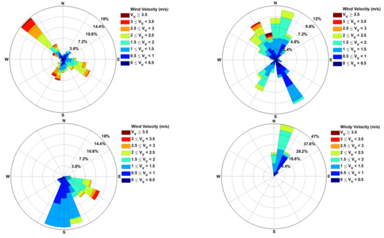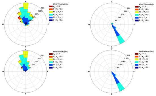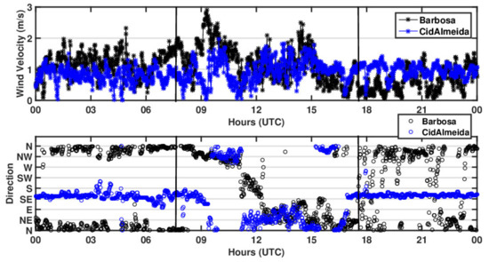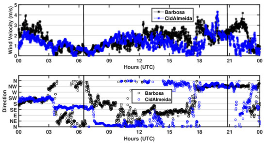 The same data represented in Figure 14 can be seen in Figure 15 for the same day, but in wind rose format. The first two wind roses (top panel) show the full day while the next two (bottom panel) only show the period of land breeze occurrences. The total 17 h, in the lower panel, are clearly marked with opposite wind directions, NNW in Barbosa and SSE in Cid Almeida station. In the upper panel a greater scatter of wind direction is visible in Barbosa, already mentioned above.