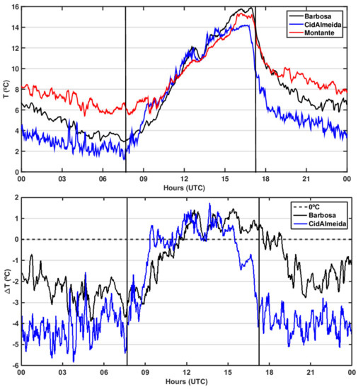 Air temperature in Alqueva (upper panel) and air temperature difference between shores and platform (lower panel) on 1 January 2019. Grey vertical lines indicate the sunrise and sunset.