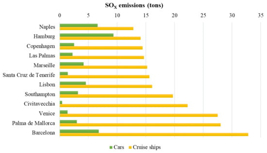Yearly SOX emissions from cruise ships and cars in some harbour cities in Europe in 2017. Adapted data from [].