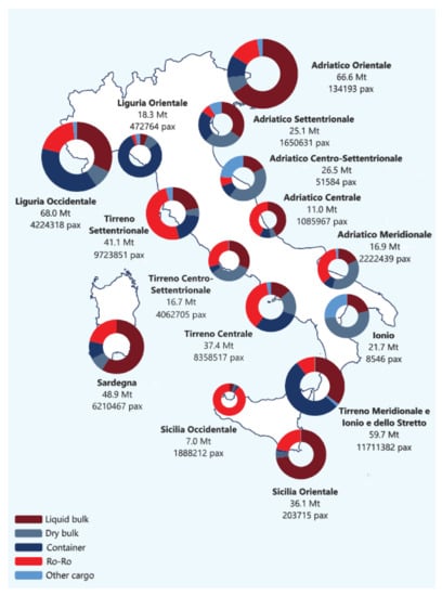 Italian harbours play a logistic role as intercontinental interchange centers, being located within important commercial routes with Europe, North Africa, and Asia. At European scale, the country is very active, with the third-largest intake traffic in the EU and the fourth-highest one in terms of export tonnage, with five of the top-40 ranking ports for tons of freight loaded and unloaded in 2015, namely Trieste, Genova, Livorno, Gioia Tauro, and Ravenna []. At national level, import/export by sea represented 38% of the total commercial exchanges in 2017, with a growth of 12.4% compared to the previous period 2012–2016. The top three ports, in terms of movements of goods, in 2017 were Trieste (62 million tons), Genoa (54.2 million tons), and Cagliari (37.9 million tons), while the highest increase (>10%) was found for Messina, La Spezia, Salerno, and Catania. The most important Italian cruise harbours are Civitavecchia and Venice, with 1.4 and 2.2 million passengers in 2017, respectively, doubled and increased by 60% from 2006 to 2017. Italy is the worldwide leader for short sea shipping (SSS), in terms of gross tonnage, number of ro-ro cargo, and passenger cargo, with Trieste and Genoa in the EU top ten of commercial ports [].