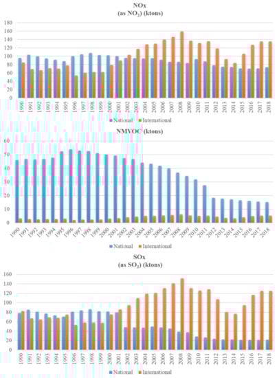 Gaseous emissions of national and international shipping, reported in the Italian emission inventory in the 28-year period 1990–2018. Data from ISPRA elaborations [].