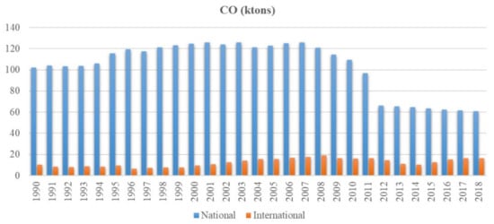 Estimates of emissions from the navigation sector were carried out in the last Italian inventory [], according to the Intergovernmental Panel on Climate Change (IPCC) guidelines and good practice guidance [,] and the EMEP/EEA guidebook []. Here, navigation was recognized as a key source category with respect to emissions of NOX, SOX, CO, PM10, PM2.5, and BC. National average emissions and consumption factors were estimated for harbour and cruise activities both for domestic and international shipping from 1990 to 1999; estimates were updated since 2000, in order to consider the most recent trends both in terms of modeling between domestic and international consumptions and improvements of operational activities in harbours []. Emissions from international navigation are also estimated and included as memorandum items but not included in national totals []. In addition, the composition of the national fleet of gasoline-fueled recreational crafts changed from 90% of two-stroke-engine-equipped vessels to 53% of four-stroke-engine ones, since 2000, thus influencing emissions of CO, NMVOC, and PM.