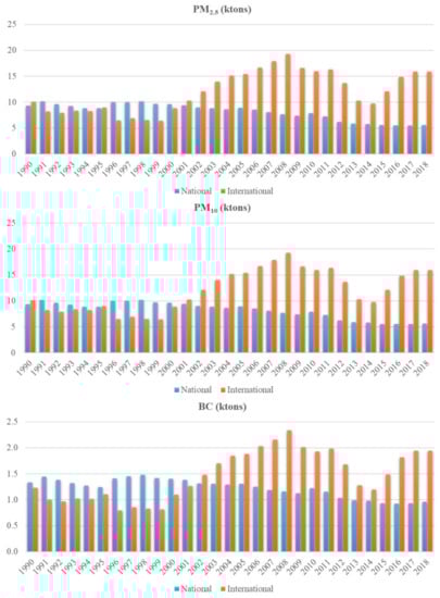 PM and BC emissions of national and international shipping, reported in the Italian emission inventory in the 28-year period 1990–2018. Data from ISPRA elaborations [].