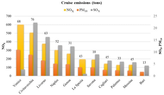 In Italy, cruise ship traffic is notably a significant sector, and the country has four of the top ten Mediterranean harbours in terms of number of passengers and port calls in 2019 []. Civitavecchia is the second harbour in Italy, after Genoa, while Naples recorded the largest increases (33.5% and 20.3%) for passengers and port calls from 2018 to 2019, respectively []. Finally, the harbours of Ravenna and Trieste are considered to have the highest potential along the Adriatic coasts, due to their strategic positions within commercial corridors and innovation skills []. In a recent report [], cruise ship emissions were estimated at port and country-level for 2017 and results only for Italian harbours are summarized in Figure 5. The highest emissions were observed for Venice, Civitavecchia, and Livorno, followed by Naples and Genoa. This is reasonable considering the highest numbers of ships and gross tonnage (not reported). Genoa had more relevant emissions with respect to other sites with comparable traffic (Cagliari, Messina, and Palermo). Venice and La Spezia showed different ratios between pollutants, with the overall lowest values of SOX emissions, also representing the minor pollutants emitted compared to PM and NOX. In Venice, this finding could be explained as an effect of the voluntary agreement named “Venice Blue Flag”, between stakeholders and ship companies, that reduced significantly not only SOX emissions but also PM primary and secondary emissions [].