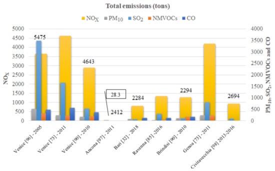 Concerning other ship categories, some commercial harbours could represent the majority in terms of gross tonnage and number of ships (i.e., ferries, cargoes). Italy has four leading hubs: Gioia Tauro, Genoa, La Spezia, and Trieste, in three different important areas and commercial networks. Emissions of different vessel categories and for each operation phase were computed in several studies in Italian harbours with activity-based methodologies, then represented as input for model simulations. Total emissions of NOX, PM10, SO2, CO and NMVOCs were calculated in some Italian harbours in different studies and ad-hoc projects by applying EMEP/EEA methodology (Figure 6).