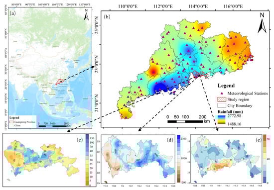 Study area location and rainfall characteristics. (a) Location of Guangdong Province; (b) spatial distribution of the mean annual rainfall in Guangdong Province from 2000 to 2019; (c) distribution map of maximum 1 h rainfall in Shenzhen from 19–22 May 2020; (d) distribution of accumulated rainfall in Shenzhen throughout 2019; (e) maximum 30 min rainfall distribution in Shenzhen from 21:00 to 23:00 on 11 April 2019. Where (c–e) were derived from the Shenzhen Climate Bulletin.