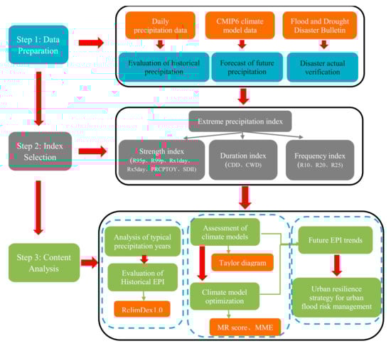 Domestic and international scholars have carried out a considerable amount of research on extreme climate change, simulation prediction, and urban response [8,9,10], mainly focusing on three aspects. Firstly, the quantitative research on extreme climate change, including the characterization definition, spatial and temporal evolution patterns, and the causes of extreme climate indices [11,12]. The Expert Team on Climate Change Detection and Indices (ETCCDI) of the World Meteorological Organization (WMO) has defined 27 extreme climate indices in terms of intensity, frequency, and duration using statistical methods such as the percentage method and threshold determination. These indices are widely used in the quantitative analysis of extreme climate change [13,14,15,16]. Secondly, the application of global climate model data to simulate and predict future extreme climate indices. The World Climate Research Program has developed the Coupled Model Inter-comparison Project (CMIP) as a database for making such predictions [17]. The latest version of the current CMIP series is CMIP6, which presents new prognostic scenarios using six integrated assessment models (IAMs), based on different shared socioeconomic pathways (SSPs) and the latest anthropogenic emission trends. The new scenarios not only include future social and economic changes (such as population, economic development, ecosystems, resources, systems, and social factors), but also future efforts to mitigate, adapt, and respond to climate change, with better resolution [18,19,20]. Many scholars have attempted to use the CMIP6 outputs to evaluate the characteristics of extreme rainfall under different scenarios in the future [21,22,23]. The result showed that extreme temperature and precipitation have shown increasing trends in this century overall, and these changes are more obvious in the CMIP6 simulation than in the CMIP5 simulation. However, not all models exhibit a better performance in a certain region. Therefore, the best choice is an optimal model prediction that can better reduce the uncertainty of the simulation. With the application of global climate model data, a large number of researchers have found that a multi-model ensemble (MME) has better evaluation performance than a single model [24,25]. The third aspect is that many scholars are committed to proposing an effective measure to enable cities to better cope with extreme climate change [26,27,28,29]. Therefore, many new concepts have been proposed, such as sponge city, Smart Water Management (SWM), flood insurance, etc.
