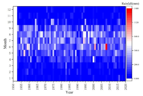 Based on the measured precipitation data of the Shenzhen Station, annual and monthly precipitation in Shenzhen from 1953 to 2020 were determined. The change in precipitation is shown in Figure 3. The redder the color, the more rainfall, and the bluer the color, the less rainfall. The mean monthly rainfall in Shenzhen was 160.8 mm, and the maximum monthly rainfall was 1395.3 mm, with rainfall mainly concentrated in April–September (accounting for 85.11% of the annual rainfall). Extreme rainfall mainly occurred in June.