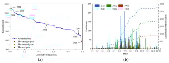 Empirical frequency ranking of precipitation in Shenzhen (a) and daily and cumulative precipitation in extreme dry, normal, and extreme wet years (b).
