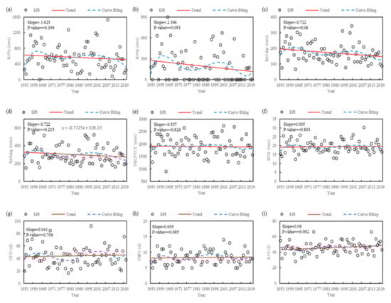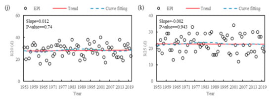 Linear trend and curve fitting of the extreme precipitation index (EPI) in Shenzhen. (a) R95p; (b) R99p; (c) Rx1day; (d) Rx5day; (e) PRCPTOT; (f) SDII; (g) CDD; (h) CWD; (i) R10; (j) R20; and (k) R25 (see Table 2 for definitions and classifications of extreme precipitation indicators).