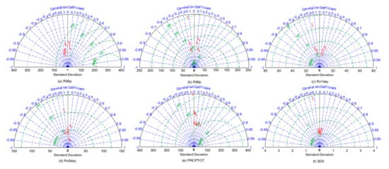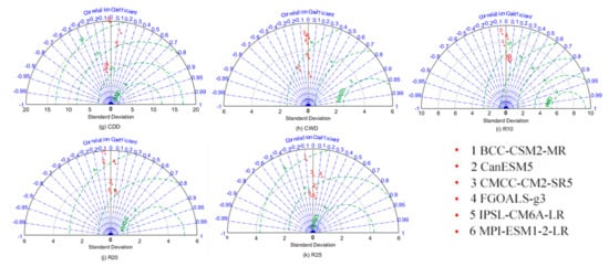 In order to objectively evaluate the simulating capabilities of the six climate models for Shenzhen’s extreme precipitation index, in this paper we counted the 11 extreme precipitation indexes simulated by each climate model during the climate reference period and compared them with actual observations. The horizontal and radian axes of the figure indicate the RSTD and COR of the simulated values relative to the measured values, respectively, while the concentric circles surrounded by green dashed lines indicate the standard RMDS of the simulated values relative to the measured values, and the red dots indicate the fitting ability of different climate models for extreme precipitation, respectively.