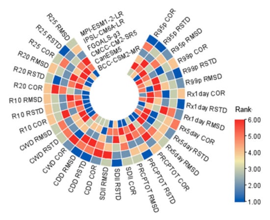 MR score ranking of climate model simulated extreme precipitation index (see Table 2 for definitions and classifications of extreme precipitation indicators).