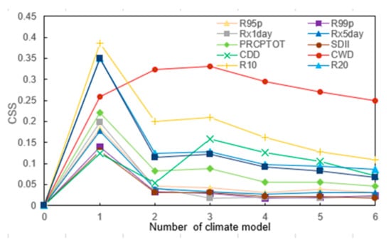 Finally, we used the comprehensive simulation scoring index (CSS) to confirm the number of optimal modes to be selected for MME; the larger the comprehensive simulation scoring index (CSS), the stronger the simulation ability. As can be seen from Figure 8, with the increase in the number of models, the overall simulation ability of MME for different extreme precipitation indices showed a trend of initially increasing and then decreasing. Therefore, according to the ranking of the comprehensive simulation capabilities of each model, we finally selected the optimal number of models for the arithmetic average, and obtained the result of the MME average. That is, for one mode that performs well, we selected the BCC-CSM2-MR modes for evaluation, such as R95p, R99p, Rx1day, Rx5day, PRCPTOT, SDII, R10, R20, and R25 indices. For the three modes that performed well, we selected the pooled mean of the BCC-CSM2-MR, MPI-ESM1-2-LR, and FGOALS-g3 modes, such as the CDD and CWD indices from Table 4, and it can be seen that the MME averaging results eventually improved the fitting ability of the extreme precipitation indices to some extent.