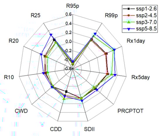 Relative changes in the extreme precipitation indices in Shenzhen under different scenarios (see Table 2 for definitions and classifications of extreme precipitation indicators).