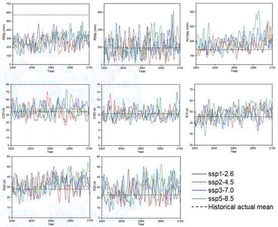 Variation series of extreme precipitation indicators in Shenzhen under four scenarios (see Table 2 for definitions and classifications of extreme precipitation indicators).